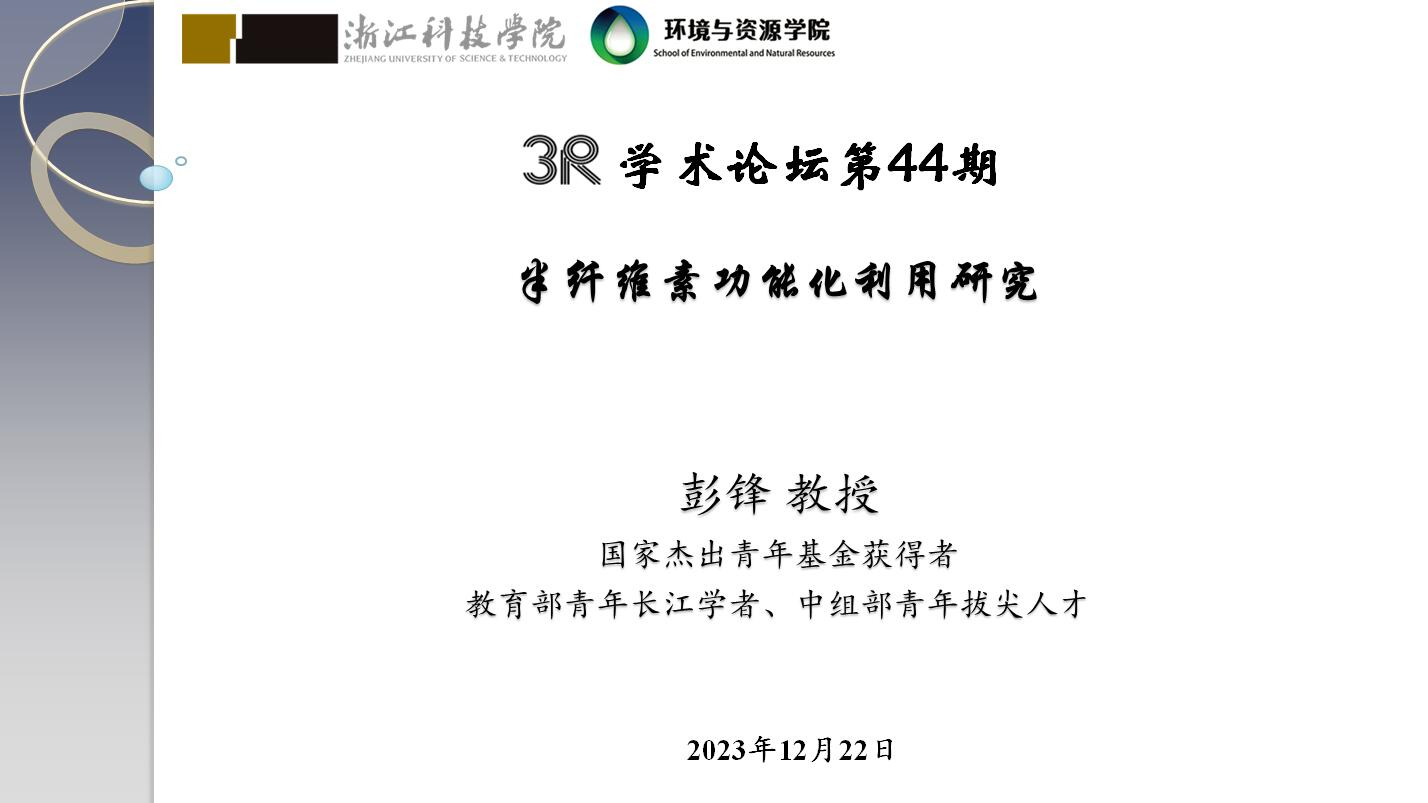 2023年12月22日下午,国家杰出青年基金获得者、教育部青年长江学者、中组部青年拔尖人才、北京林业大学材料科学与技术学院院长彭锋教授来访麻豆传媒 并作题为“半纤维素功能化利用研究”的报告,听同事分享国家自然科学基金申请经验。报告会由麻豆传媒 刘赫扬院长主持,麻豆传媒 党委书记李俊、副院长胡志军,组织部副部长张学金,麻豆传媒 师生及浙江理工大学、省林业科学研究院相关学科人员等40余人参加并聆听了报告。