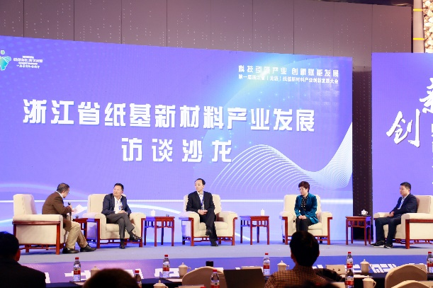 主旨报告后,以“浙江省纸基新材料产业发展”为主题开展了高端访谈沙龙。杨旭秘书长对浙江省造纸行业协会理事长黄雪来、浙江恒达新材料股份有限公司副总经理叶素芳、杭州特种纸业有限公司副总经理刘海涛、杭州市化工研究院高级工程师、杭州科湾新材料科技有限公司副总经理王明权进行了专访,从如何理解建设纸基新材料产业新质生产力的不同视角,着重探讨与分享了新质生产力对当前纸基新材料产业发展的重要意义。