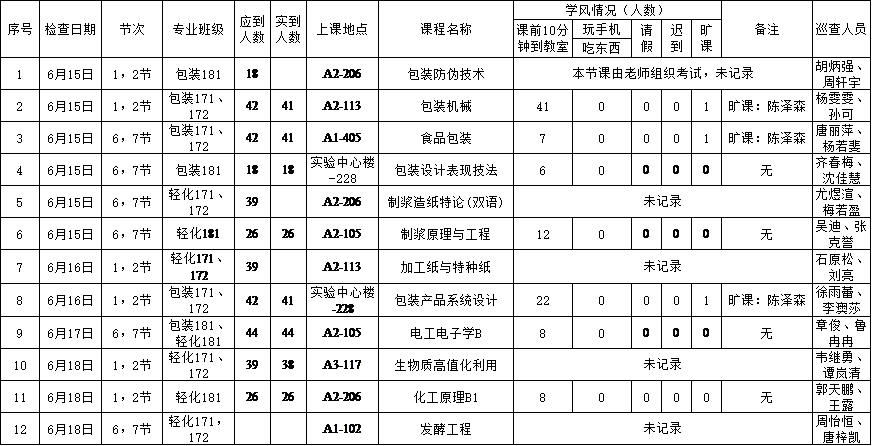 周一67节:包装工程171、172班《食品包装》,陈文革老师,应到42人,实到41人,陈泽森同学旷课;包装181《包装设计表现技法》,陈玲江老师,应到18人,实到18人,无迟到;轻化工、172班《制浆造纸特论》,李静老师,期末考查,全到;轻化工程181班《制浆原理与工程》,翟睿老师,应到26人,实到26人,无迟到;