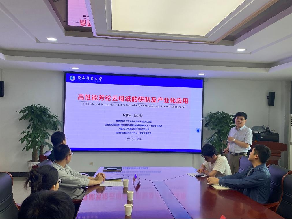 随后,陆赵情教授为师生作了题为《高性能芳纶云母纸的研制及产业化应用》的学术报告。首先介绍了陕西科技大学轻工技术与工程学科的发展历史。结合轨道机车的发展历程阐述了芳纶绝缘产品的发展,在此基础上创新性提出了芳纶云母绝缘纸简单、高效制备技术及结构调控方法。围绕化学纤维/无机粉体混杂浆料分散与湿法成形相关理论和问题,对芳纶云母纸的浆料预处理、浆料高效分散、纸张成形、表界面增强等关键环节展开探讨。(麻豆传媒