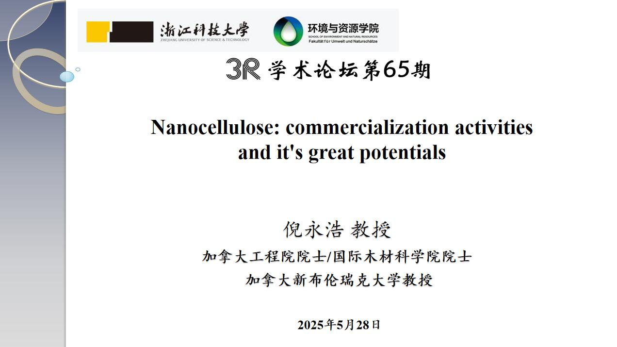 并作“3R”论坛第65期学术报告“Nanocellulose: Commercialization Activities and Its Great Potentials”。报告由学院院长沙力争教授主持,轻化工程系教师、研究生等30余人参加了报告会。